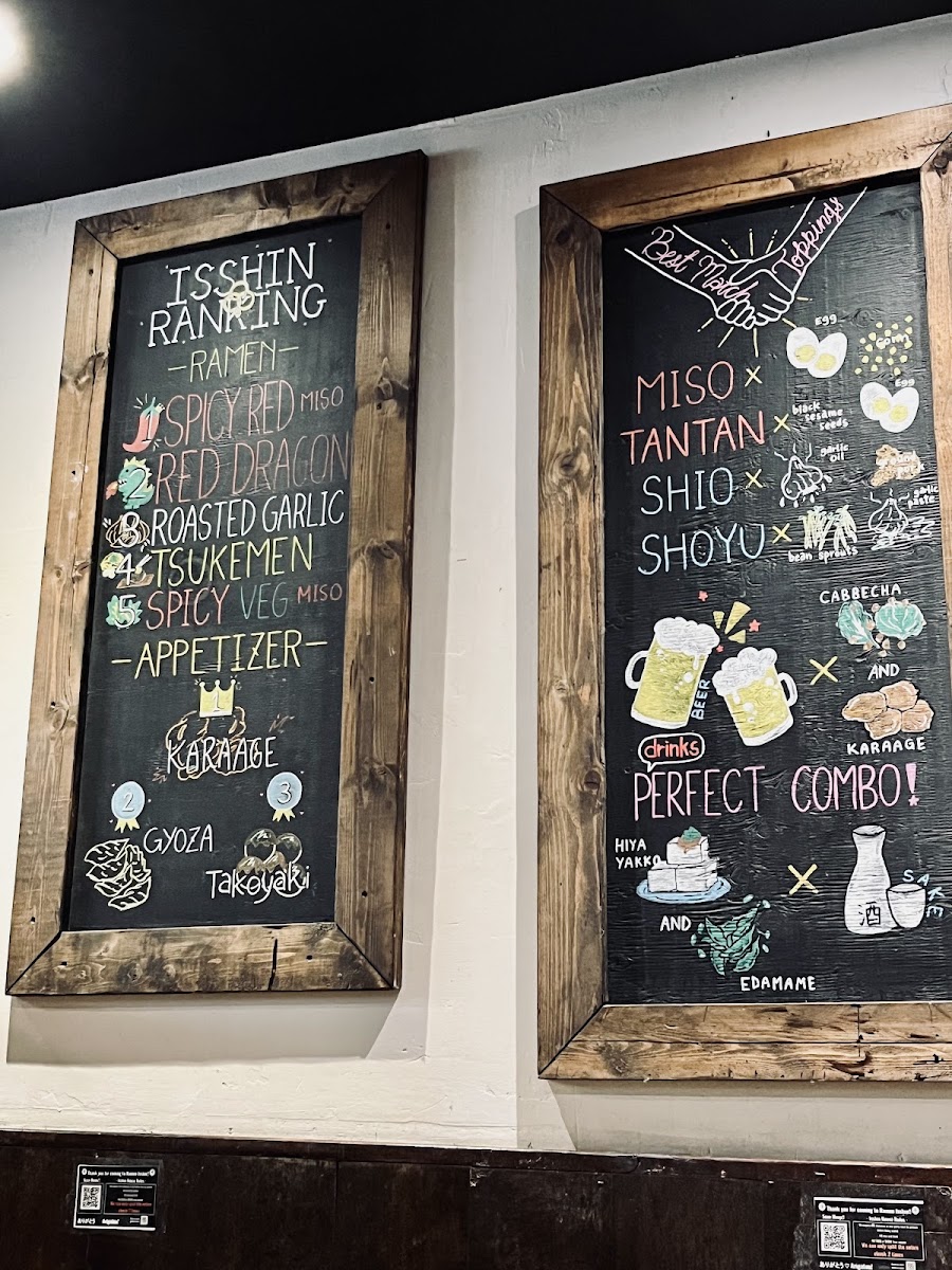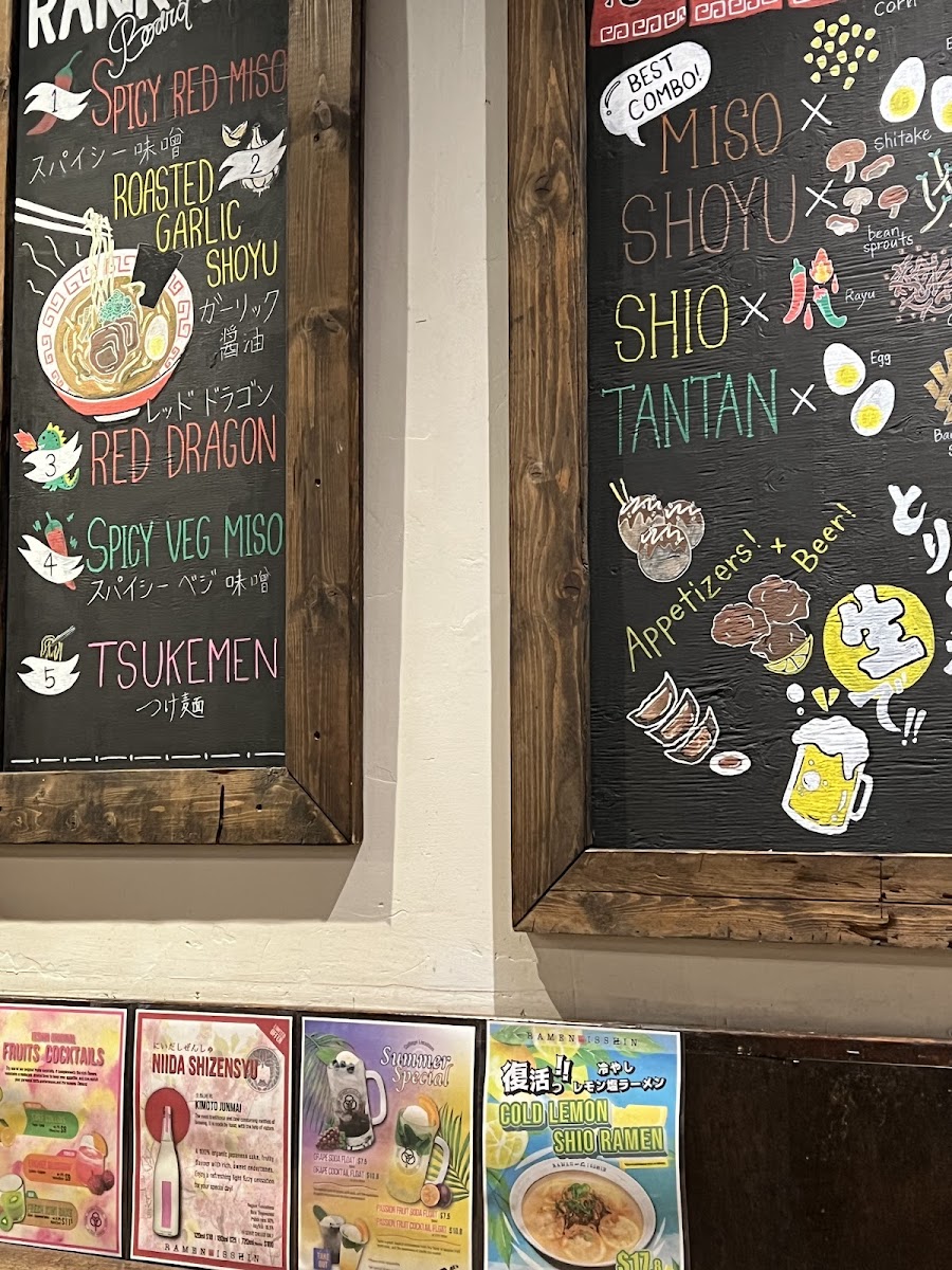 The menu at Ramen Isshin College also includes options for vegetarians, such as the Spicy Veggie Miso Ramen with red miso blend and wok-fried ground tofu. Additionally, customers can choose from a variety of drinks including Ramune and Oi Ocha (Japanese Green Tea) to complement their meal.